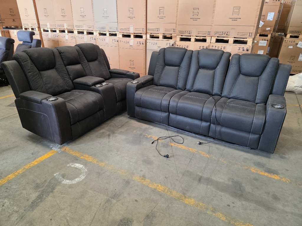 3 seater & 2 seater electric recliner leather upholstery couches 3 seater Dimensions approximately: 95cmH x 206cmW x 75cmL2 seater Dimensions approximately: 95cmH x 183cmW x 75cmLNote: Major wear, cords may be incomplete