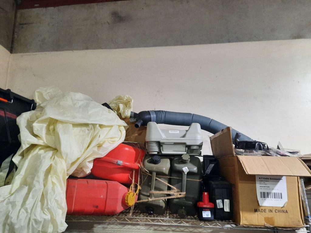 Assorted Diy items, including battery, cable accesories, jerry cans and more