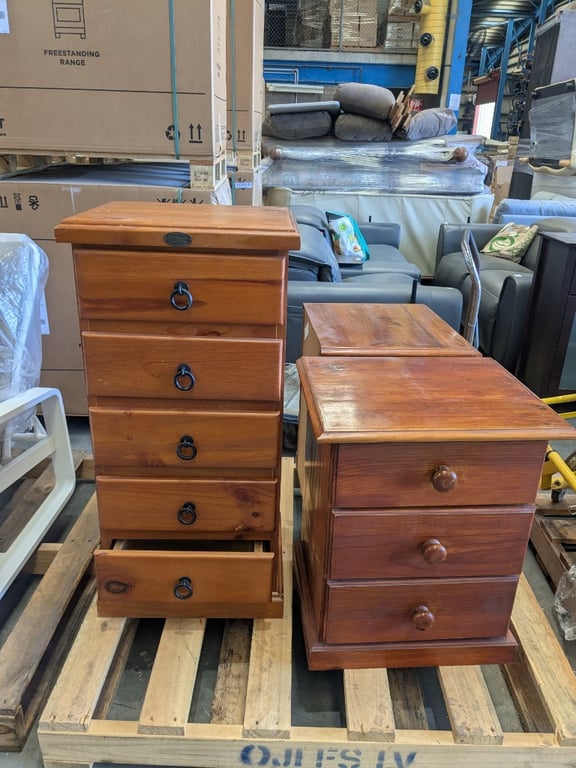 Assorted lot of bedside tables & Slime tallboy, Size 62cm,52cm,42cm Size 96cm,46cm, 40cmNOTE: SCUFFS AND MARKS