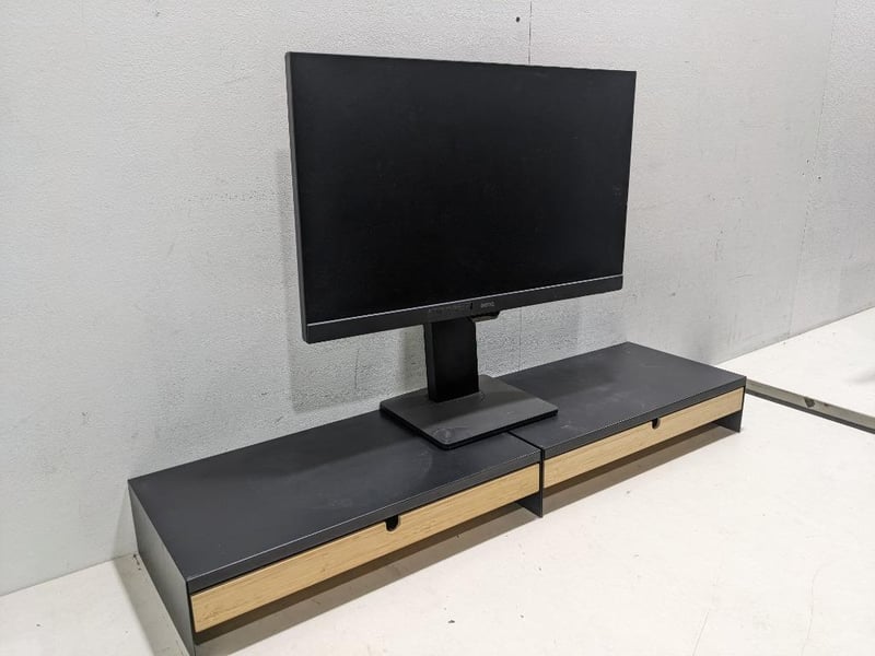 Office workstation setup - Includes:- Computer Monitor - Benq GW2485-B, 24" IPS FHD, DOM: 12/21, S/N: ETVCM06644SL0- Monitor Stands - Ikea Elloven, black aluminium, bamboo drawer, DOM: 2021, 470mm (W) x 260mm (D) x 100mm (H)Note: Signs of minor wear consistent with prior use. Monitor is untested & has a structural impairment, refer to photo.Sold as lot