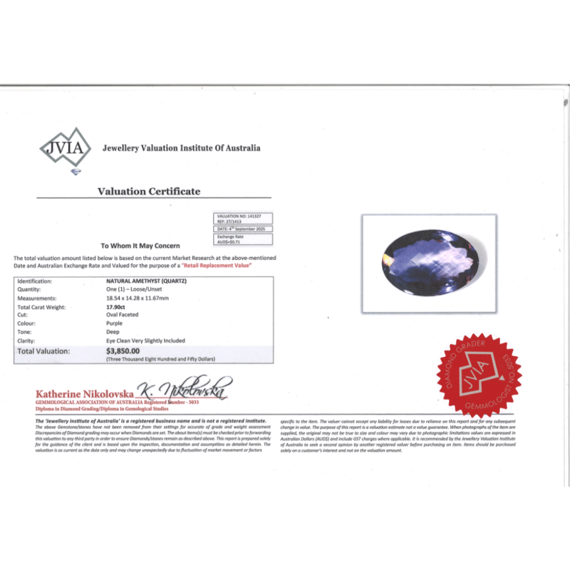 17.90CT NATURAL AMETHYST. Oval Cut, Deep Purple, Eye Clean-Slightly Included, Loose, Unset. Valuations Provided by an Independent Third-Party Professional Not Directly Associated With Lloyds Auctions at AUD $$3,850.00This valuation has been conducted by an independent third-party professional. The valuation amount is an assessment by the issuing valuer and does not reflect the auction value of the item. Any inquiries regarding the valuation should be directed to the issuing valuer (refer to contact details on the certificate), as Lloyds Auctions has no affiliation or influence over the valuation, the valuer, or the stated amount. Condition: Good - Refer Images 0645840+2161
