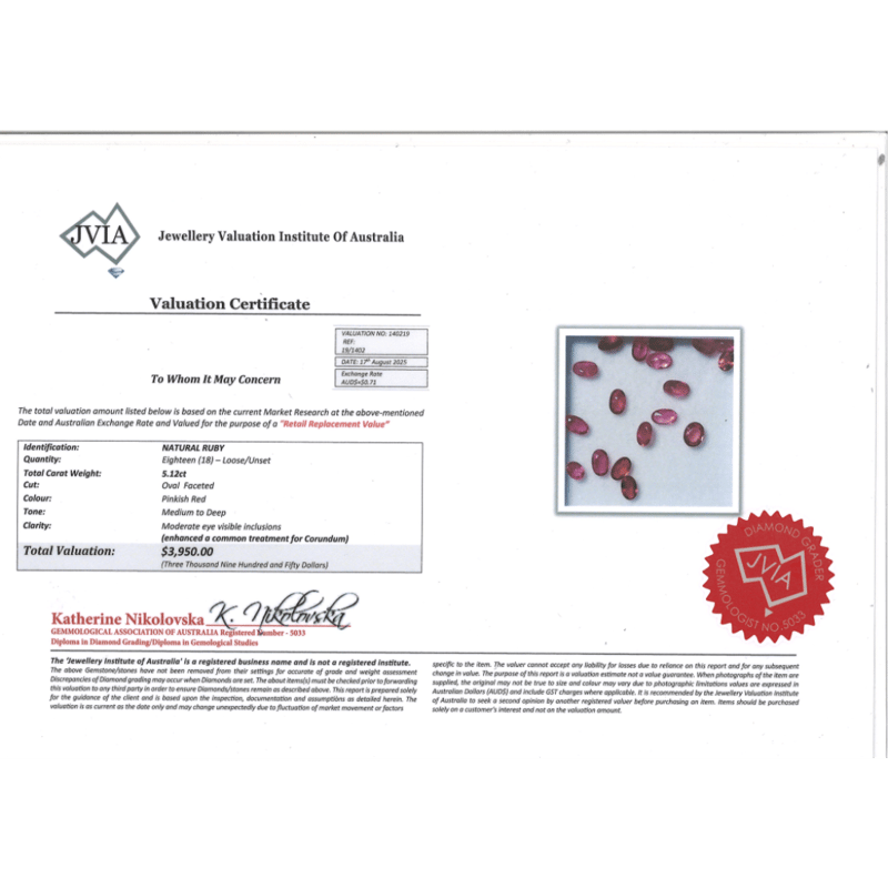 5.12CT TSW X 18, NATURAL CORUNDUM RUBIES. Oval Faceted Cut, Pinkish-Red, Moderate Eye Visible Inclusions, Loose, Unset. Valuations Provided by an Independent Third-Party Professional Not Directly Associated With Lloyds Auctions at AUD $$3,950.00This valuation has been conducted by an independent third-party professional. The valuation amount is an assessment by the issuing valuer and does not reflect the auction value of the item. Any inquiries regarding the valuation should be directed to the issuing valuer (refer to contact details on the certificate), as Lloyds Auctions has no affiliation or influence over the valuation, the valuer, or the stated amount. Condition: Good - Refer Images 0645840+2176