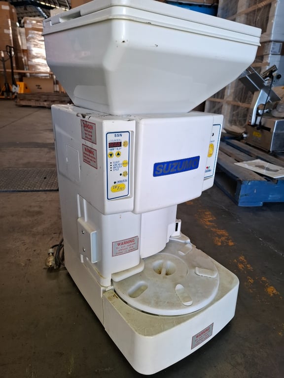 Sushi Robot Make: Suzumo Machinery co.ltd Model: SSN-ELX Power: 110 W Voltage: AC 100V - 240 V Dimensions: 72 cm H x 36 cm W x 48cm D Description/ Extras: includes operation manual, assembling and disassembling prcedure , working condition unknown, cleaning required, heavy item