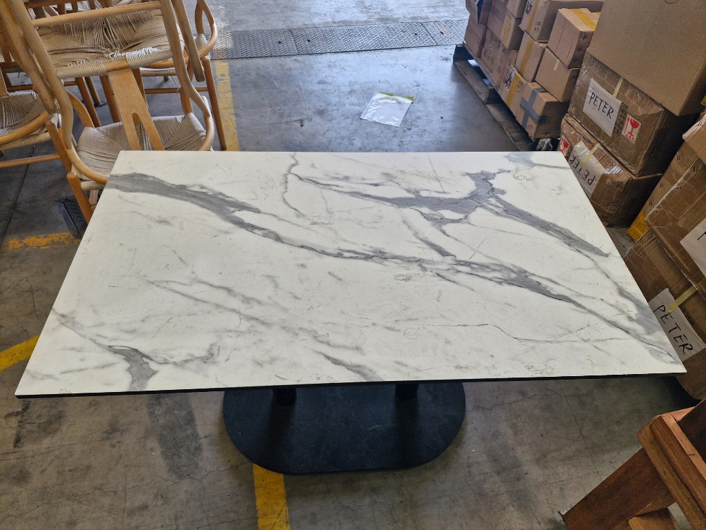Cafe Tables, Marble Look Veneer tops to metal legs, 120cmW x 70cmD x 72chH