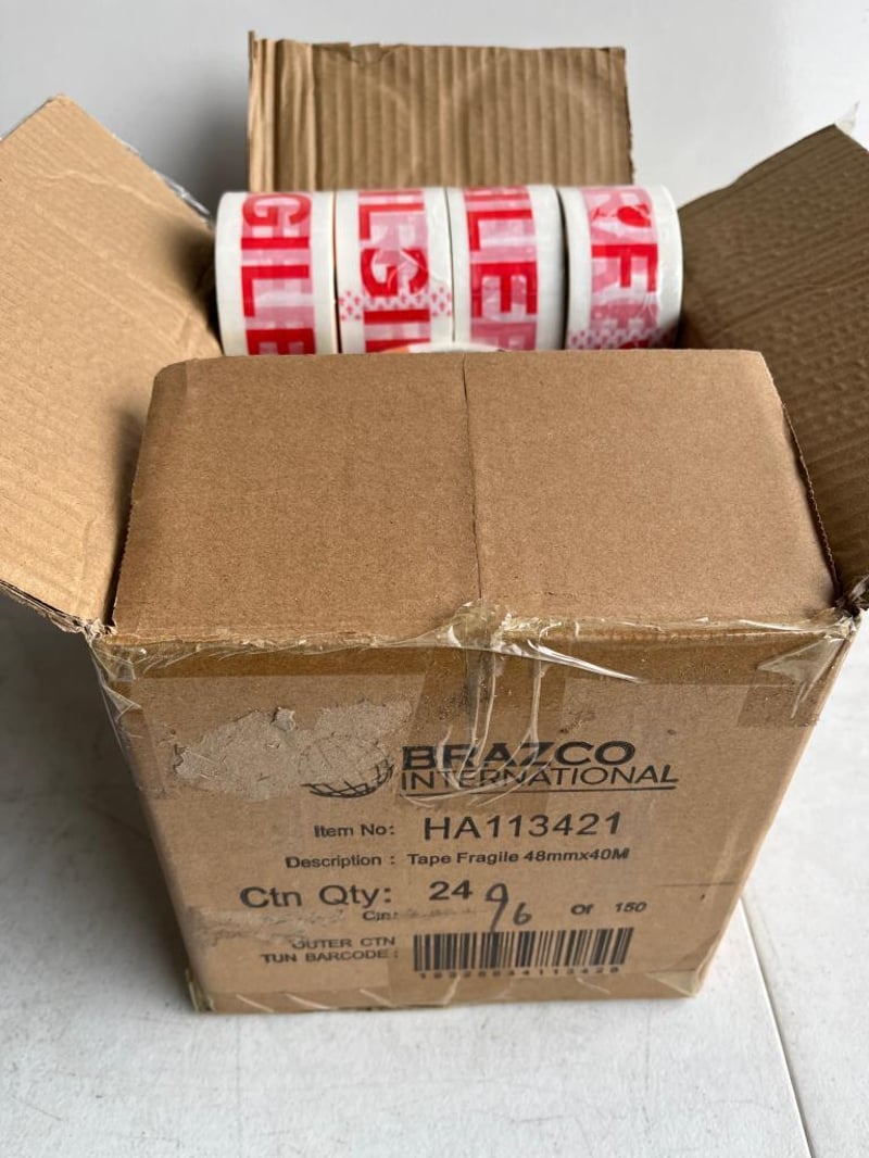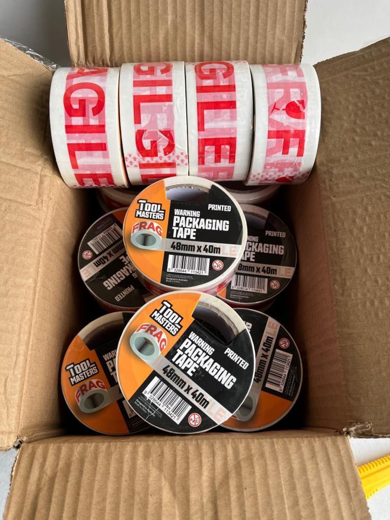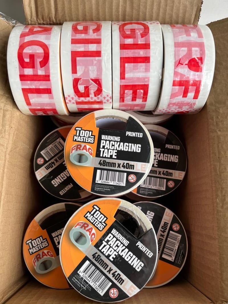 Case of 24 Rolls FRAGILE Tape 48mm wide 40 metres per roll Red on White Brand New SOLD AS 1 LOT