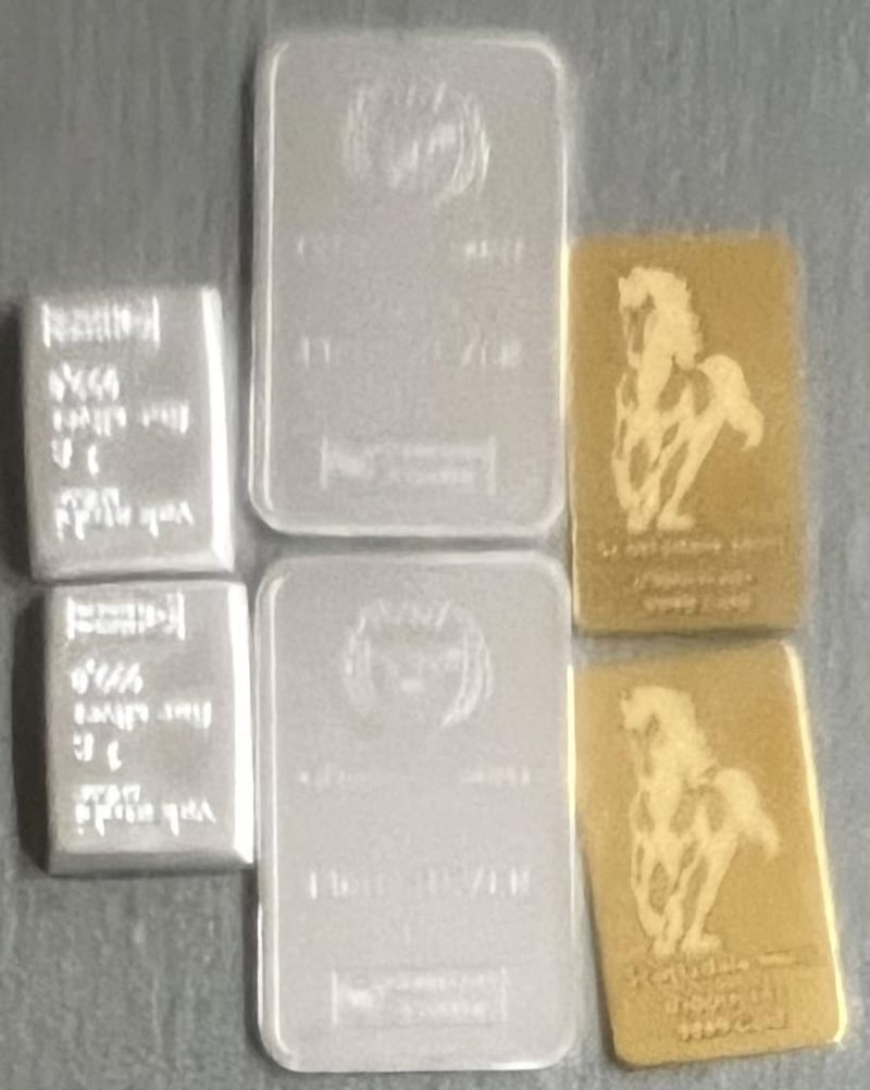1/100 SCOTTDALE GOLD BAR X 2, 1 GRAM VALCUMBI SILVER BAR X 2 & 1 GRAM GERMANIA MINT SILVER BAR X 2
