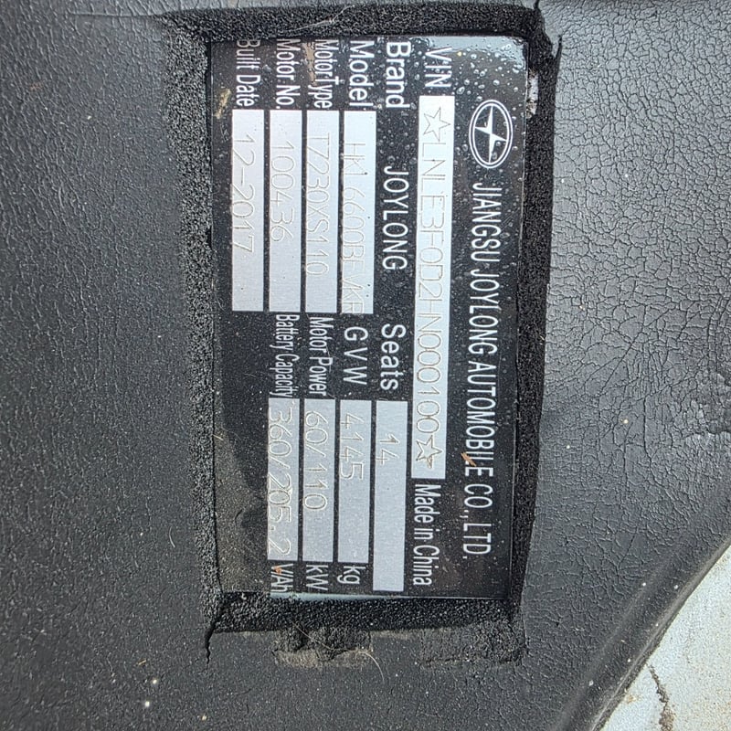 2017 Joylong 14 Seater Bus Year: 2017 Make: Joylong Model: HKL6600BFVKT Body: 12 Seat Bus Drive Type: 2WD Odometer Indicating: 9,477 Kilometres Engine: Electric TZ230XS110 Transmission: Automatic Colour: White Seats: 14 Power: 360V / 205.2AH / 60/110KW Description/extras: Air-Conditioning, Fold Down Seats, Inbuilt Display, Diagnostic & Control Panel, UNUSED, Side and Rear Access, Automatic Side Step VIN No: LNLE3FOD2HN000100 GVM: 4145 Kilograms