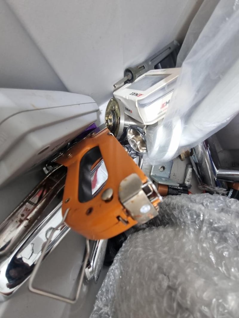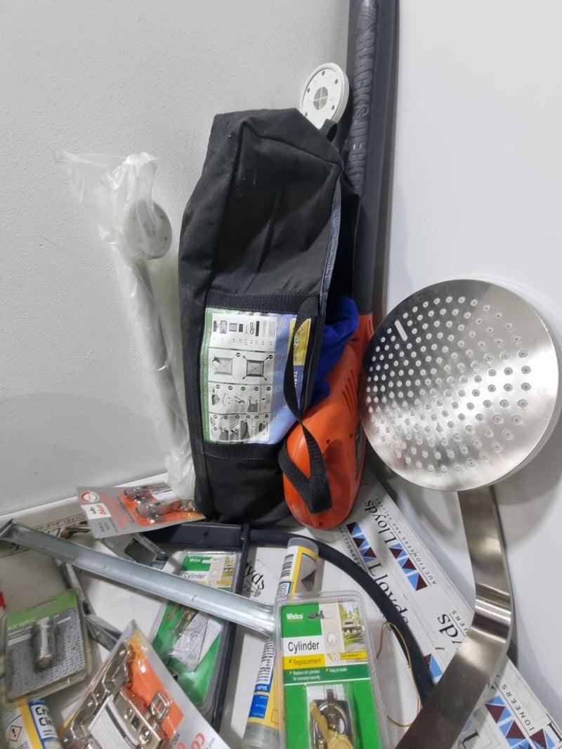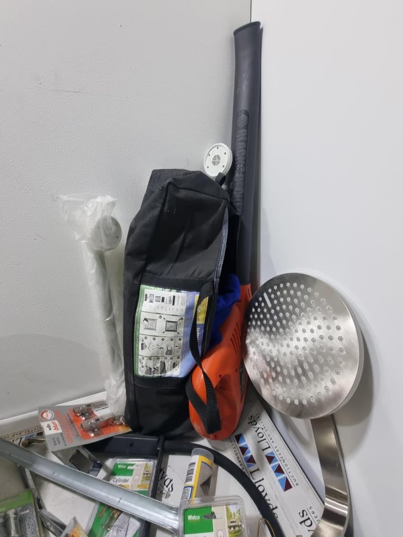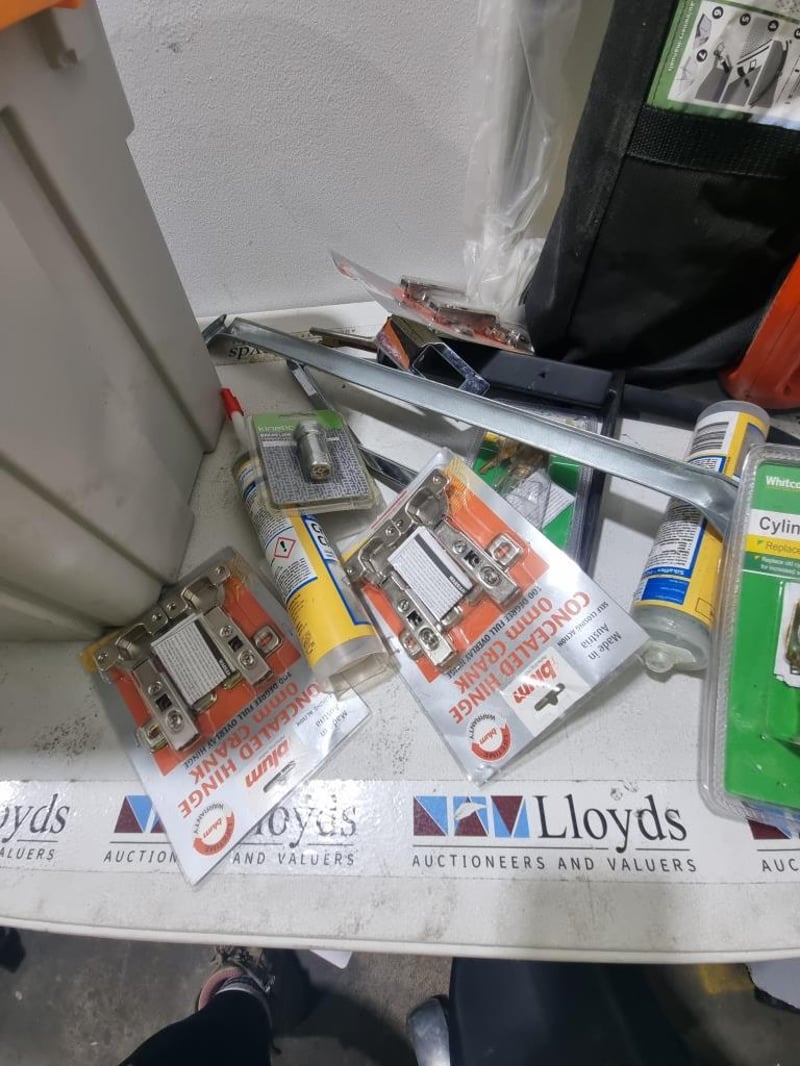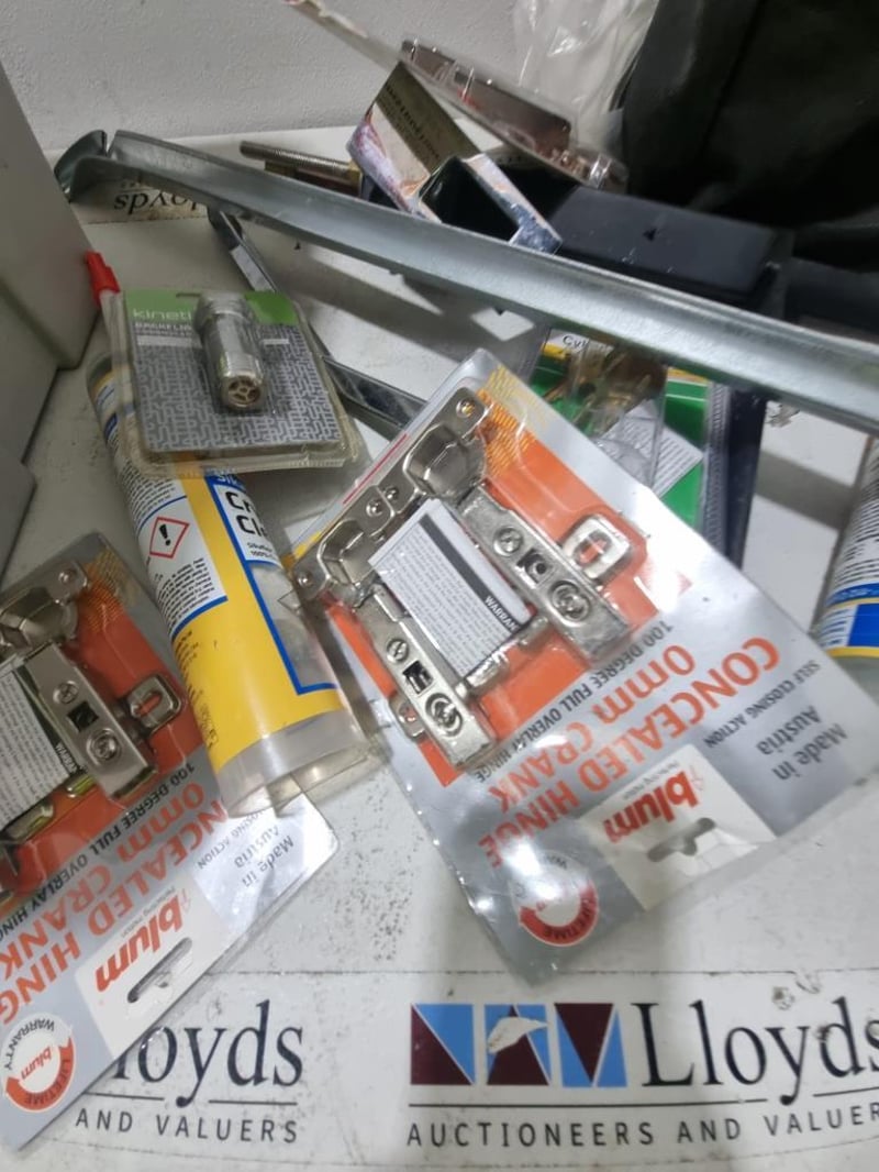 Assorted tools and parts lot, includes blower, hinges and more..... Sold as lot