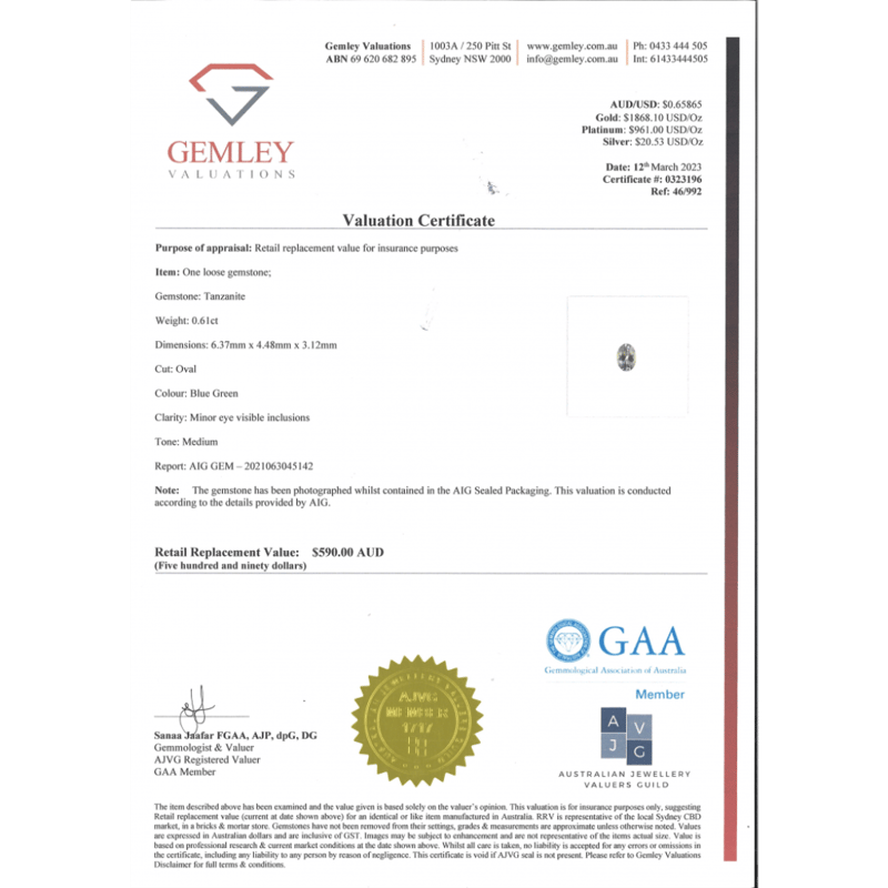 0.61CT CERTIFIED, NATURAL TANZANITE. Oval Cut, Medium Blue-Green, Minor Eye Visible Inclusions, Loose, Unset. Stone Comes Sealed With Aig Report: Gem2021063045142. Condition: New. Valuations Provided by an Independent Third-Party Professional Not Directly Associated With Lloyds Auctions at AUD $$590.00This valuation has been conducted by an independent third-party professional. The valuation amount is an assessment by the issuing valuer and does not reflect the auction value of the item. Any inquiries regarding the valuation should be directed to the issuing valuer (refer to contact details on the certificate), as Lloyds Auctions has no affiliation or influence over the valuation, the valuer, or the stated amount. Condition: Good - Refer Images 0645840+2111