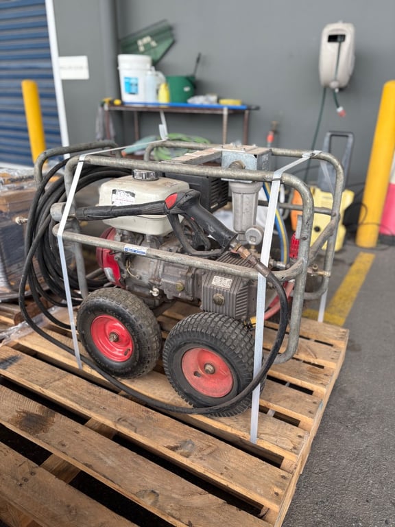 Aussie Pumps Heavy-Duty Pressure WasherModel: KTV4040 Pump (Bertolini, Italy),4000 PSI / 275 Bar, 15 L/min Flow, 8 kW Output, Powered by Honda GX390 Petrol Engine. Mounted on Four-Wheel Trolley Frame with Hose and Gun Assembly. Used condition with wear and surface corrosion consistent with age and use.