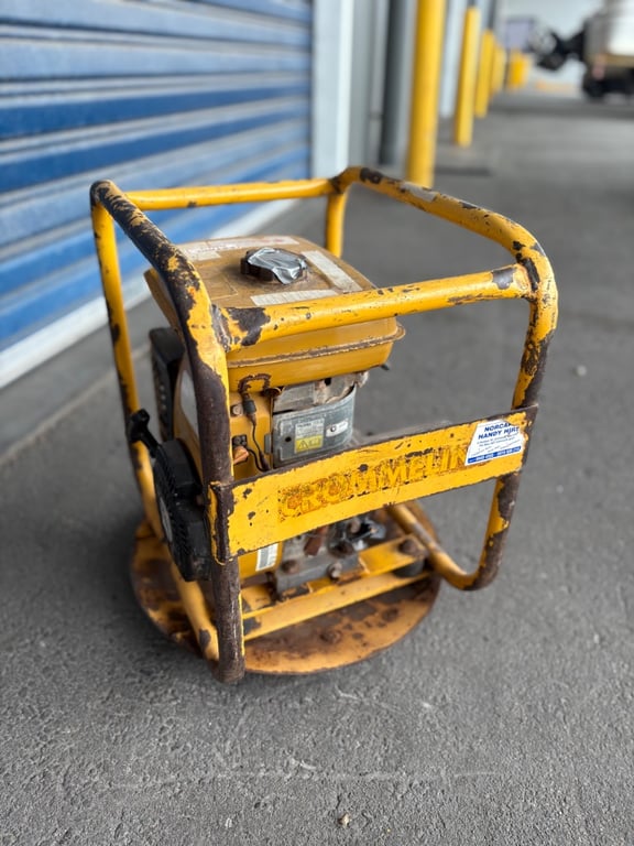 Crommelins Concrete Power Trowel / Finishing MachineSerial Number: A6370, Engine: Robin EY20-3D Petrol Engine (3.7kW @ 4000RPM), Made in Japan. Mounted in protective yellow cage frame. Used condition with surface rust, scratches, and wear consistent with site use.