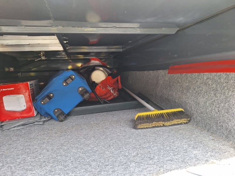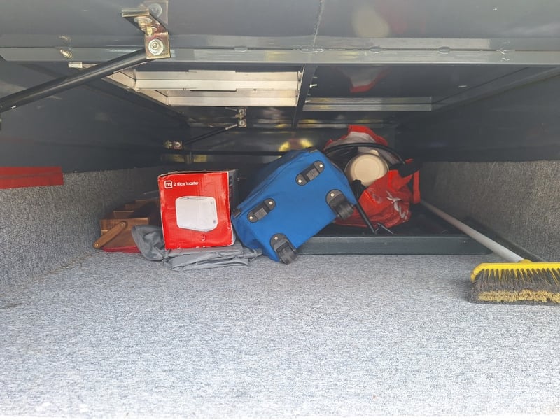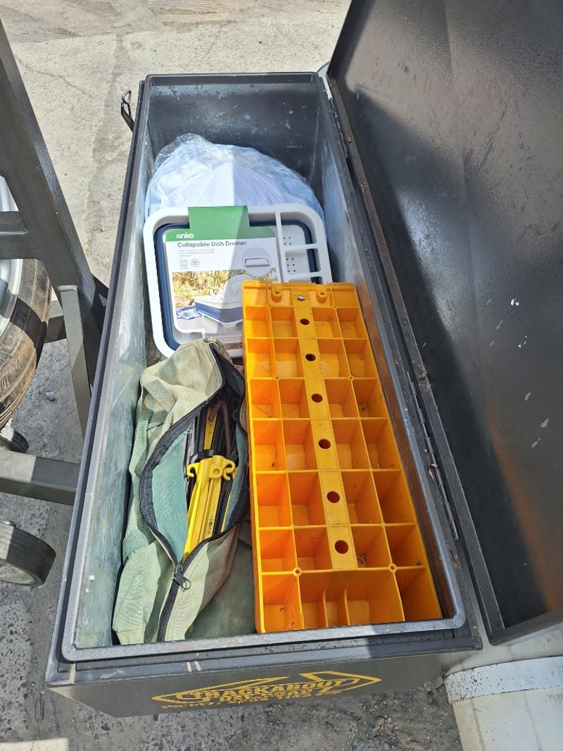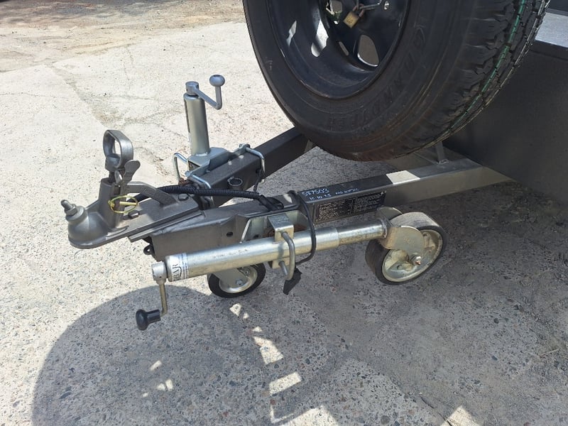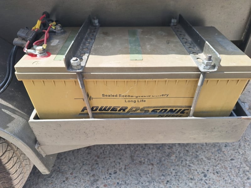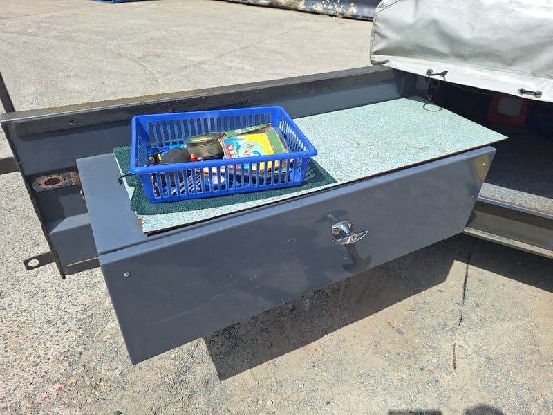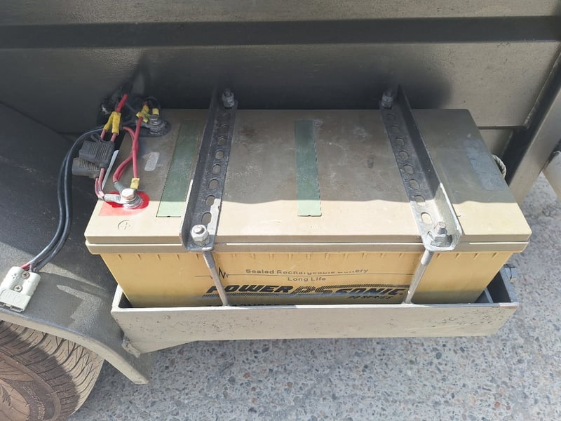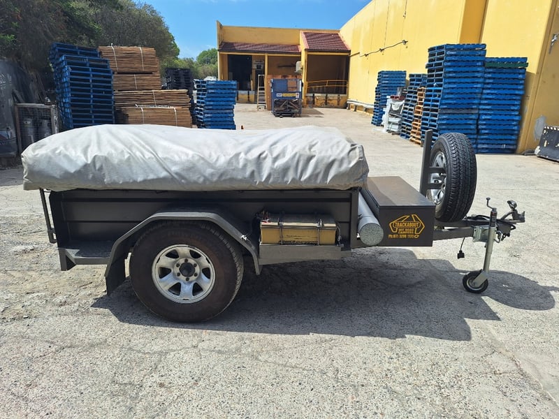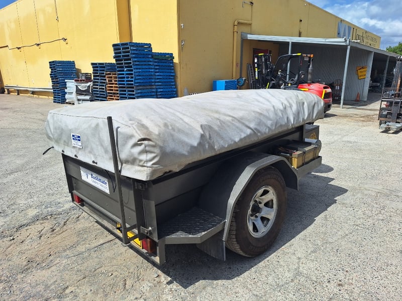 Description/Extras: Soft Top Side Folding Camper Trailer, 50mm Hitch, Dual Jockey Wheels, 7-Pin Flat Male Connection, Spare Tyre, Front Mounted Tool, Box With Accessories, Power Sonic Rechargeable Long Life Battery, With Anderson Plug, Pegs, Poles, Rear Stabilisation Legs