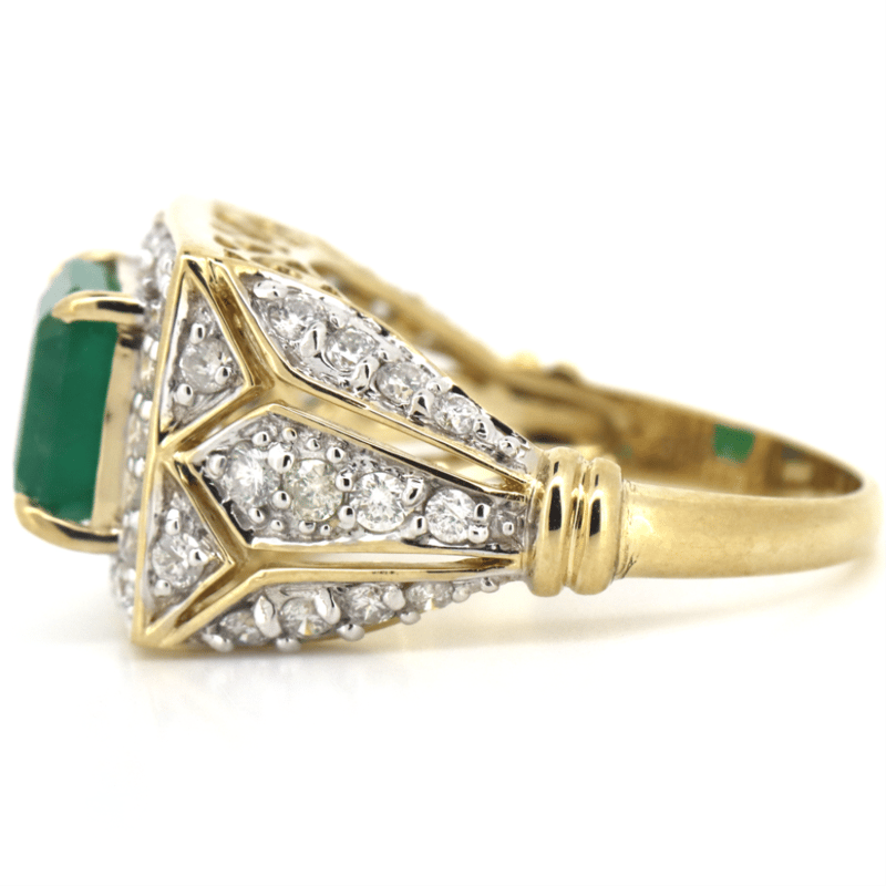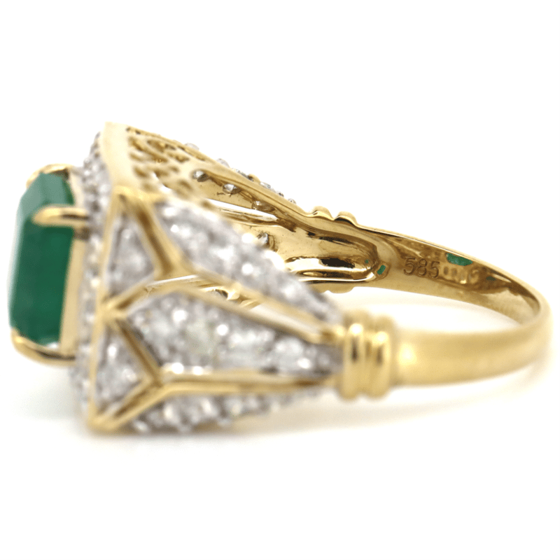 14K YELLOW GOLD, EMERALD AND DIAMOND, HALO RING.