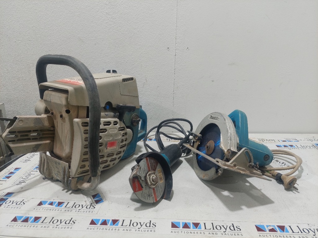 Assorted power tools. Includes Makita chainsaw head, angle grinder and circular saw. Sold as a lot. Notes: untested, signs of wear and tear
