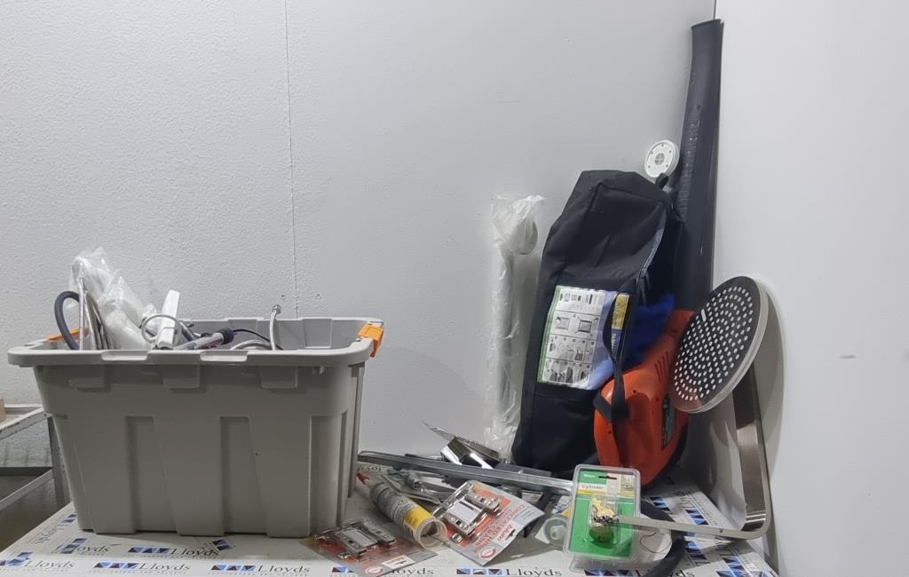 Assorted tools and parts lot, includes blower, hinges and more..... Sold as lot