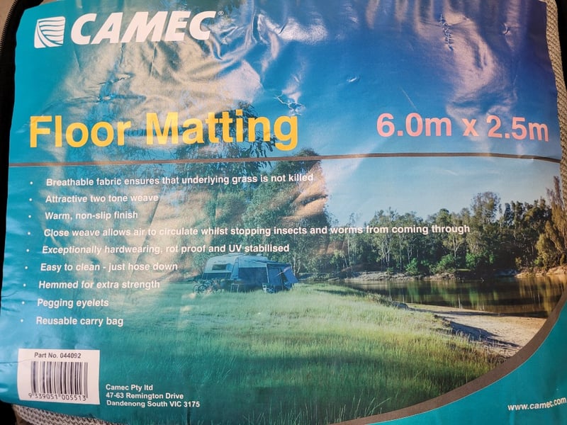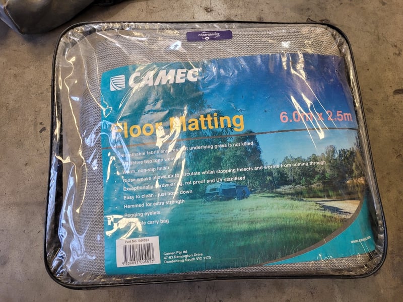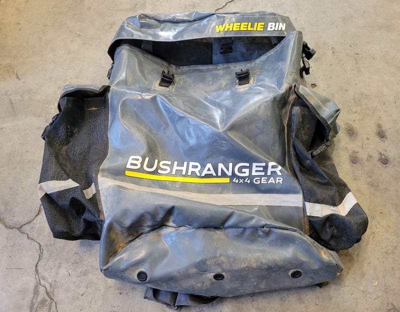 Bushranger Wheelie Bin Bag And Camec Floor MattingDescription: Wheelie bin/spare wheel bag designed for off-road vehicles. It is used to store rubbish, recyclables, or wet gear outside of the vehicle's interior. Camera 6.0m x 2.5m weaved floor matting in carry bag.