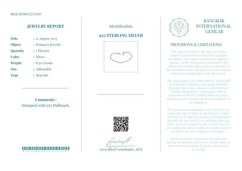 925 STERLING SILVER BRACELET - WITH DIGITAL CERTIFICATE ONLY Gemstone : 925 Sterling SilverCertificate (Digital): Bigl20240122133247Item Total Weight : 8.5 GramsMain Stone Color : SilverSize : AdjustableComments : Stamped With 925 Hallmark.✻ Verify Report Online At Www.Bangkokinternationalgemlab.Co Condition: Good - Refer Images 0161136+52