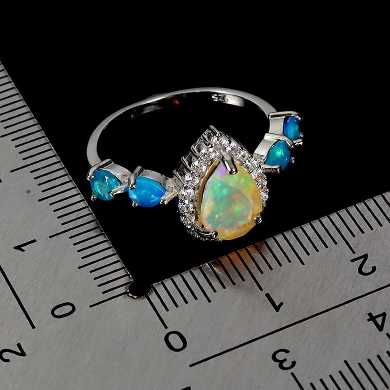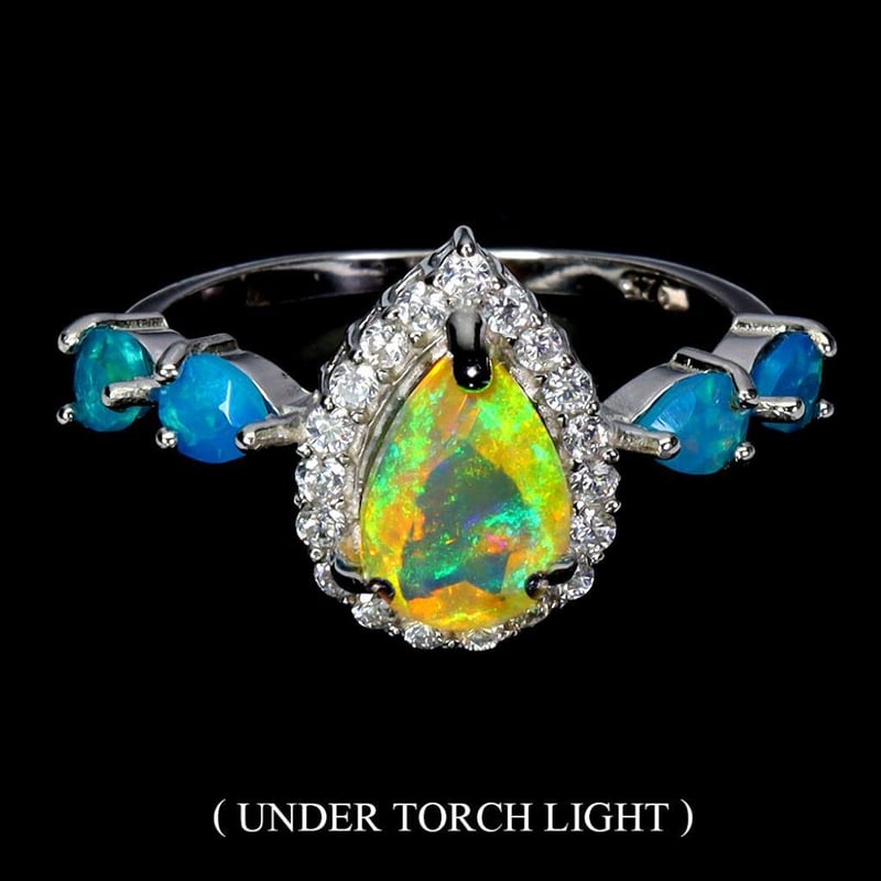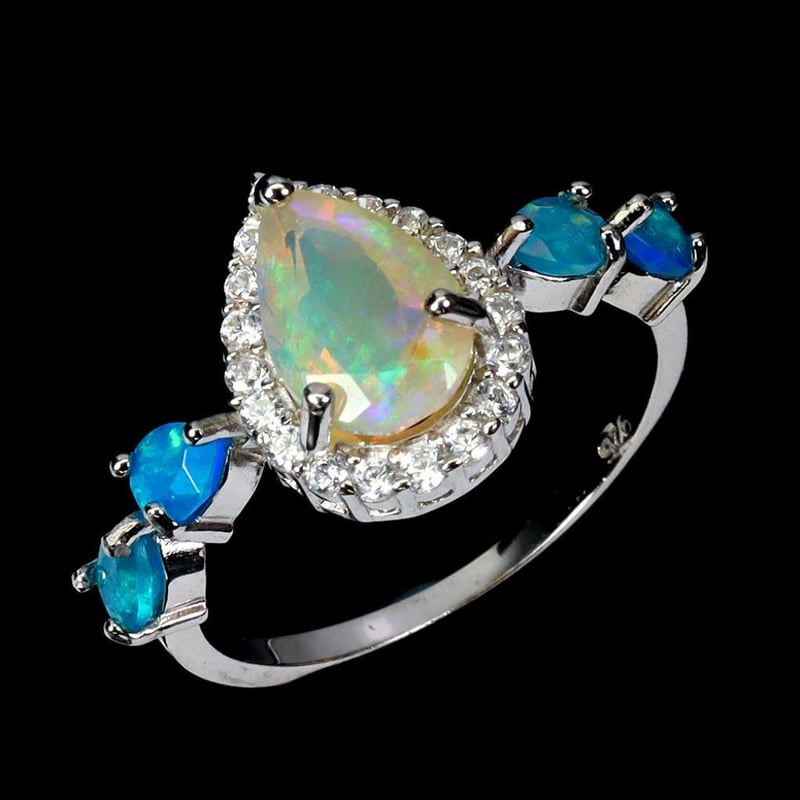 Natural Fire Opal & Blue Opal Ring. Made In Solid Sterling Silver And Plated In14K White Gold. Features Natural Rainbow Fire Opal And Natural Blue Opals. Ring Size 7