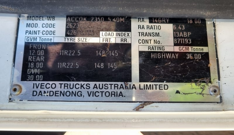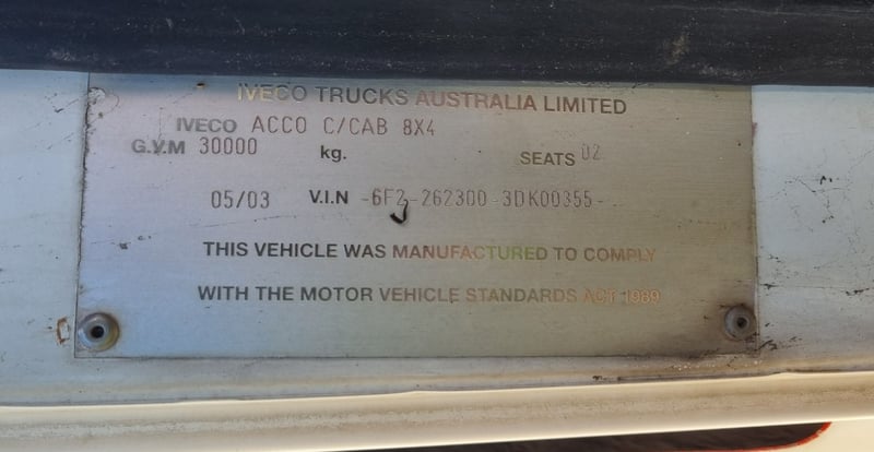 2003 Iveco Acco Concrete Truck 2350 Year: 2003 Make: Iveco Model: Acco Concrete Truck Series: 2350 Body: 2-Door Drive Type: Rear wheel drive Odometer: Indicating 380,078 Kilometres Engine: 8.3 I6 Turbo Petrol Transmission: Automatic Colour: White Seats: 2 Configuration: 8x4 GVM: 30000 kg Description/extras: Engine Hours: 25210 Notes: Windscreen cracked/chipped, Roof lining cut, batteries may need replacing, Warning Engine light on dash VIN: 6F22623003DK00355 ENG No: ESN46295070 (AS PER PPSR) (Key #CTM21 Marple) Lloyd's stock #161142+1