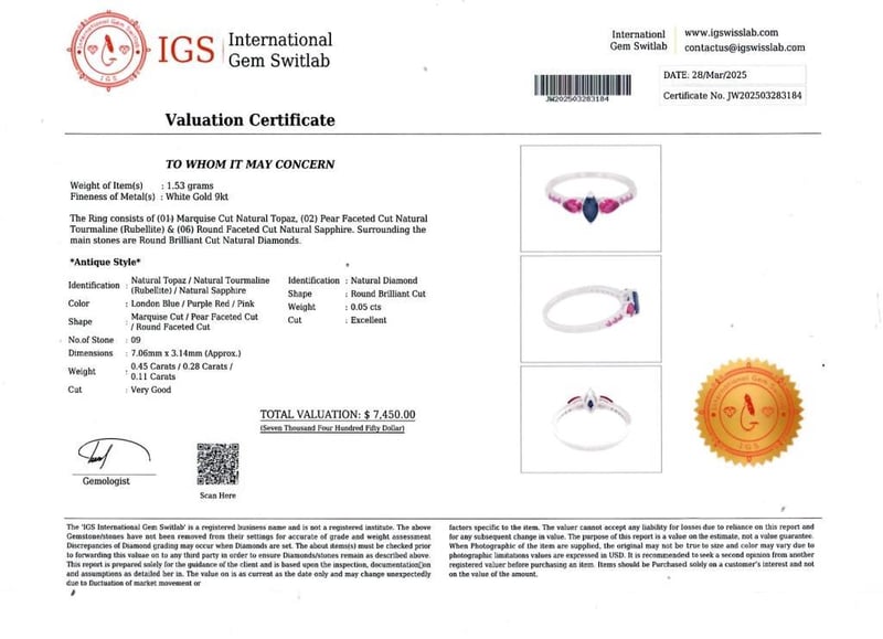 9CT WHITE GOLD TOPAZ, TOURMALINE, SAPPHIRE AND DIAMOND RING Ring White Gold 9K Natural Topaz : 0.45 Carat Natural Tourmaline : 0.28 Carat Natural Sapphire : 0.11 Carat Natural Diamond : 0.05 Carat Item Weight : 1.53 G Valuations Provided by an Independent Third-Party Professional Not Directly Associated With Lloyds Auctions at AUD $7450This valuation has been conducted by an independent third-party professional. The valuation amount is an assessment by the issuing valuer and does not reflect the auction value of the item. Any inquiries regarding the valuation should be directed to the issuing valuer (refer to contact details on the certificate), as Lloyds Auctions has no affiliation or influence over the valuation, the valuer, or the stated amount. Condition: Good - Refer Images 0586170+283184
