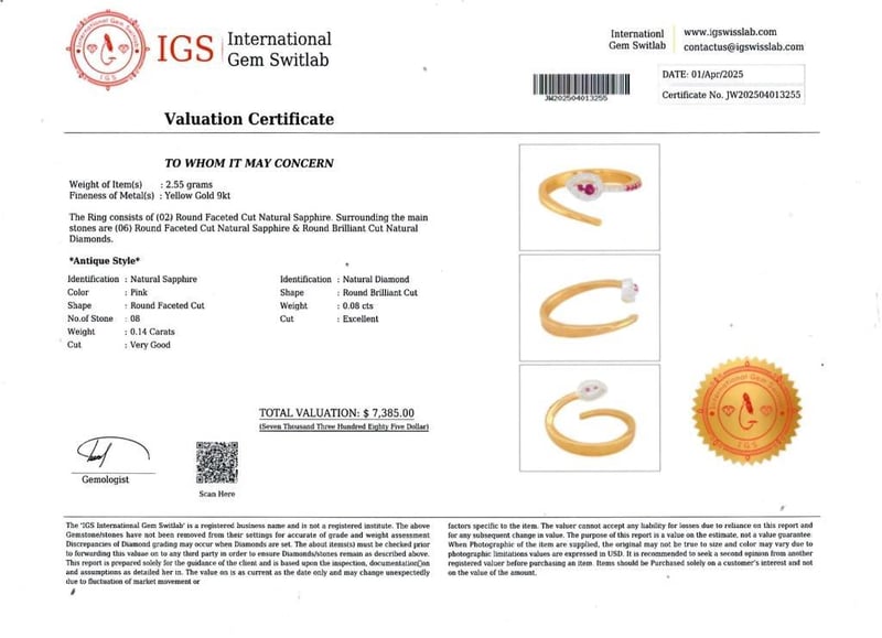 9CT YELLOW GOLD PINK SAPPHIRE AND DIAMOND RING Ring Yellow Gold 9K Natural Pink Sapphire : 0.14 Carat Natural Diamond : 0.08 Carat Item Weight : 2.55 G Valuations Provided by an Independent Third-Party Professional Not Directly Associated With Lloyds Auctions at AUD $7385This valuation has been conducted by an independent third-party professional. The valuation amount is an assessment by the issuing valuer and does not reflect the auction value of the item. Any inquiries regarding the valuation should be directed to the issuing valuer (refer to contact details on the certificate), as Lloyds Auctions has no affiliation or influence over the valuation, the valuer, or the stated amount. Condition: Good - Refer Images 0586170+13255