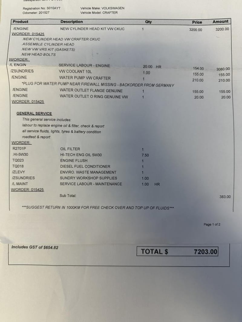 Vendor Advises: Major engine work completed 29/01/25 incl. new assembled cylinder head (VW Crafter CKUC) with new VRS gasket kit and head bolts. Approx. 20hrs engine labour. Cooling system refreshed (water pump, genuine VW fittings, coolant). Full service completed. Total $7,203. See last photo for reference