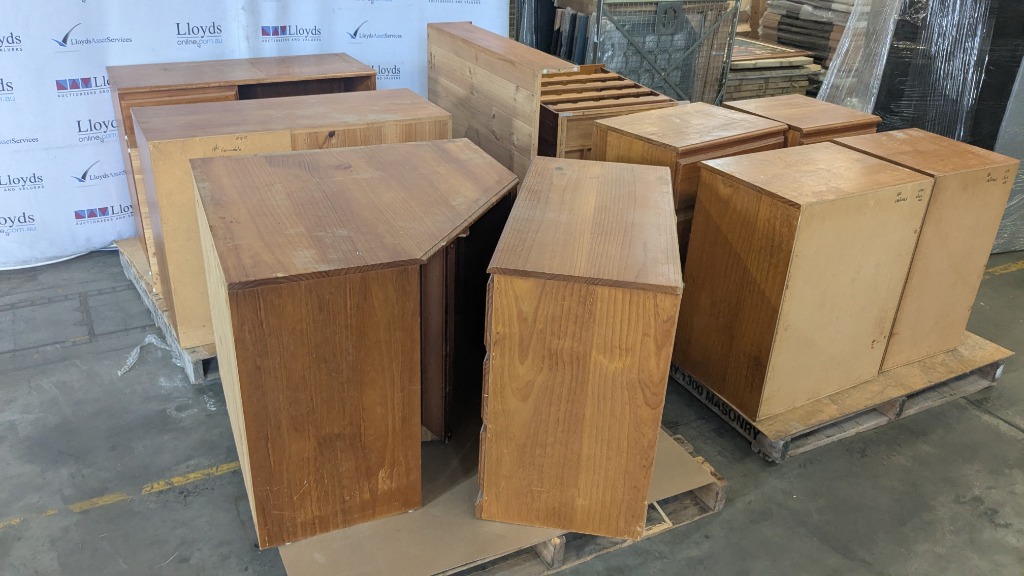 Assorted furniture, staned Timber, desks, shelves, win rack & moreDimensions desk : 1050mm(W) x 460mm(D) 760mm(h)Dimensions corner desk : 900mm(W) x 900mm(D) 750mm(h)SOLD AS LOT