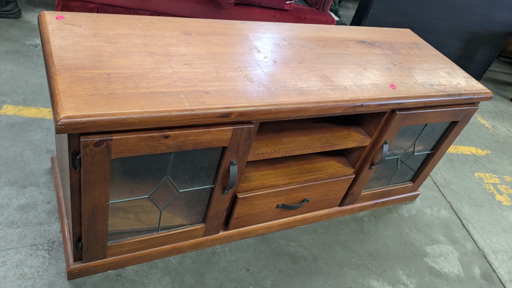 TV Cabinet, Medium Stained Timber, Slide out Drawer, Side StorageDimensions: 1570mm(W) x 520mm(D) x 640mm(H)