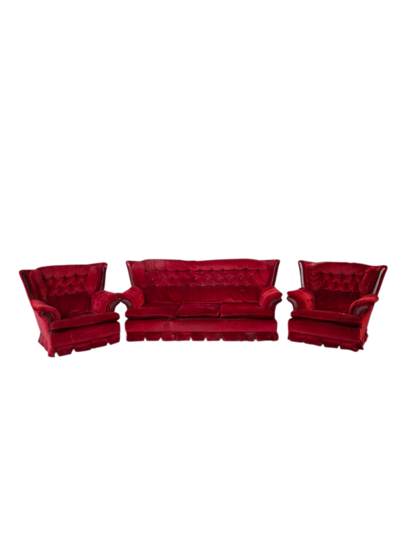 Lounge suit including 1x 3 seater lounge, 2x single seater red fabric upholstery Dimensions: 2000mm (W) x 800mm (D) 870mm (H) Dimensions: 1050mm (W) x 800mm (D) 870mm (H) NOTE: CLEANING REQUIRED