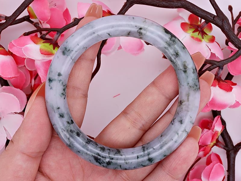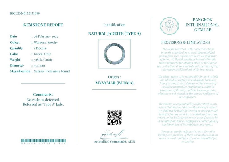 NATURAL BURMESE JADE BANGLE - WITH DIGITAL CERTIFICATE ONLY Gemstone : Natural Burmese JadeCertificate (Digital): Bigl20240122131089Item Total Weight : 328.82 GramsMain Stone Color : Green, GraySize : 55.1Comments : No Resin Is Detected.Referred As 'Type A' Jade.✻ Verify Report Online At Www.Bangkokinternationalgemlab.Co Condition: Good - Refer Images 01611138+3