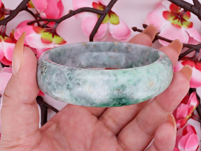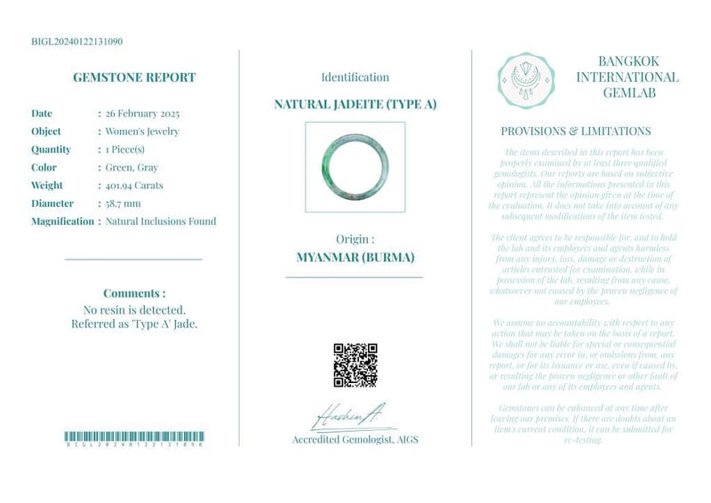 NATURAL BURMESE JADE BANGLE - WITH DIGITAL CERTIFICATE ONLY Gemstone : Natural Burmese JadeCertificate (Digital): Bigl20240122131090Item Total Weight : 401.94 GramsMain Stone Color : Green, GraySize : 58.7Comments : No Resin Is Detected.Referred As 'Type A' Jade.✻ Verify Report Online At Www.Bangkokinternationalgemlab.Co Condition: Good - Refer Images 01611138+4
