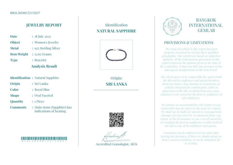 NATURAL SRI LANKAN SAPPHIRE BRACELET ON 925 SILVER - WITH DIGITAL CERTIFICATE ONLY Gemstone : Natural Sri Lankan SapphireCertificate (Digital): Bigl20240122132627Item Total Weight : 12.65 GramsMain Stone Color : Royal BlueSize : Comments : Main Stone (Sapphire) Has Indications Of Heating.✻ Verify Report Online At Www.Bangkokinternationalgemlab.Co Condition: Good - Refer Images 01611138+11