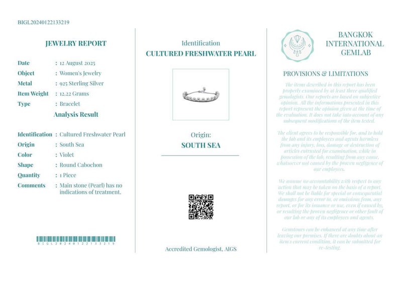 CULTURED PEARL BRACELET ON 925 SILVER - WITH DIGITAL CERTIFICATE ONLY Gemstone : Cultured Freshwater PearlCertificate (Digital): Bigl20240122133219Item Total Weight : 12.22 GramsMain Stone Color : VioletSize : Comments : Main Stone (Pearl) Has No Indications Of Treatment.✻ Verify Report Online At Www.Bangkokinternationalgemlab.Co Condition: Good - Refer Images 01611138+50