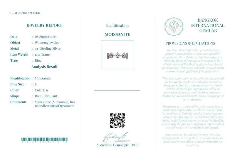 MOISSANITE RING ON 925 SILVER - WITH DIGITAL CERTIFICATE ONLY Gemstone : MoissaniteCertificate (Digital): Bigl20240122133144Item Total Weight : 1.54 GramsMain Stone Color : ColorlessSize : 6Comments : Main Stone (Moissanite) Has No Indications Of Treatment.✻ Verify Report Online At Www.Bangkokinternationalgemlab.Co Condition: Good - Refer Images 01611138+45