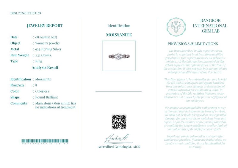 MOISSANITE RING ON 925 SILVER - WITH DIGITAL CERTIFICATE ONLY Gemstone : MoissaniteCertificate (Digital): Bigl20240122133159Item Total Weight : 2.73 GramsMain Stone Color : ColorlessSize : 8Comments : Main Stone (Moissanite) Has No Indications Of Treatment.✻ Verify Report Online At Www.Bangkokinternationalgemlab.Co Condition: Good - Refer Images 01611138+46