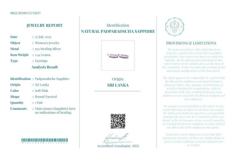 NATURAL PADPARADSCHA SAPPHIRE (UNHEATED) EARRINGS ON 925 SILVER - WITH DIGITAL CERTIFICATE ONLY Gemstone : Natural Padparadscha Sapphire (Unheated)Certificate (Digital): Bigl20240122132657Item Total Weight : 1.54 GramsMain Stone Color : Soft PinkSize : Comments : Main Stones (Sapphire) Have No Indications Of Heating.✻ Verify Report Online At Www.Bangkokinternationalgemlab.Co Condition: Good - Refer Images 01611138+13