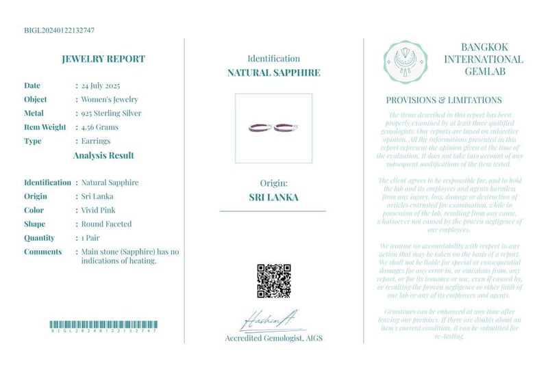 NATURAL SRI LANKAN SAPPHIRE EARRINGS ON 925 SILVER - WITH DIGITAL CERTIFICATE ONLY Gemstone : Natural Sri Lankan SapphireCertificate (Digital): Bigl20240122132747Item Total Weight : 4.56 GramsMain Stone Color : Vivid PinkSize : Comments : Main Stone (Sapphire) Has No Indications Of Heating.✻ Verify Report Online At Www.Bangkokinternationalgemlab.Co Condition: Good - Refer Images 01611138+19