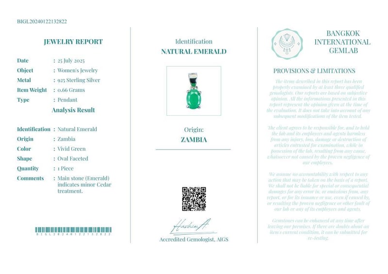 NATURAL ZAMBIAN EMERALD PENDANT ON 925 SILVER - WITH DIGITAL CERTIFICATE ONLY Gemstone : Natural Zambian EmeraldCertificate (Digital): Bigl20240122132822Item Total Weight : 0.66 GramsMain Stone Color : Vivid GreenSize : Comments : Main Stone (Emerald) Indicates Minor Cedar Treatment.✻ Verify Report Online At Www.Bangkokinternationalgemlab.Co Condition: Good - Refer Images 01611138+24
