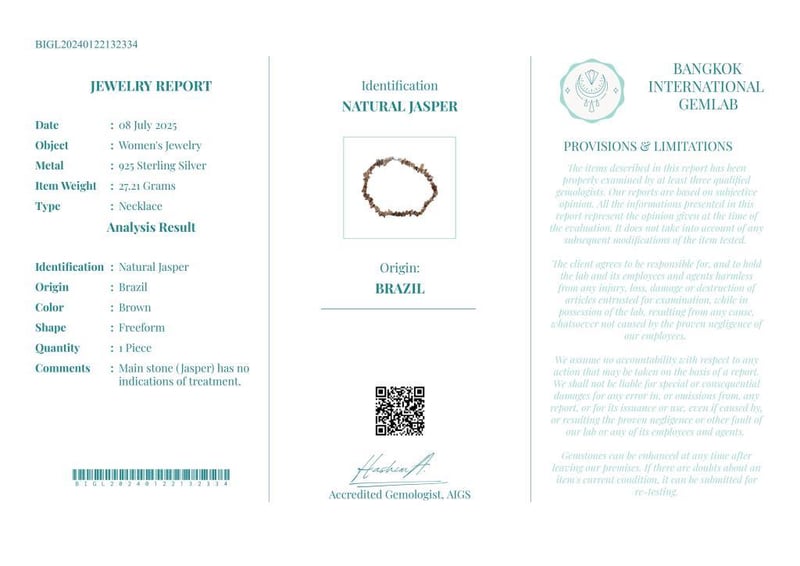 NATURAL JASPER FREEFORM NECKLACE ON 925 SILVER - WITH DIGITAL CERTIFICATE ONLY Gemstone : Natural Jasper FreeformCertificate (Digital): Bigl20240122132334Item Total Weight : 27.21 GramsMain Stone Color : BrownSize : Comments : Main Stone (Jasper) Has No Indications Of Treatment.✻ Verify Report Online At Www.Bangkokinternationalgemlab.Co Condition: Good - Refer Images 01611138+55