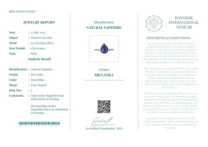 NATURAL SRI LANKAN SAPPHIRE RING ON 925 SILVER - WITH DIGITAL CERTIFICATE ONLY Gemstone : Natural Sri Lankan SapphireCertificate (Digital): Bigl20240122132687Item Total Weight : 1.89 GramsMain Stone Color : Royal BlueSize : 7Comments : Main Stone (Sapphire) Has Indications Of Heating.Surrounding Stones (Sapphire) Have No Indication Of Heating.✻ Verify Report Online At Www.Bangkokinternationalgemlab.Co Condition: Good - Refer Images 01611138+15