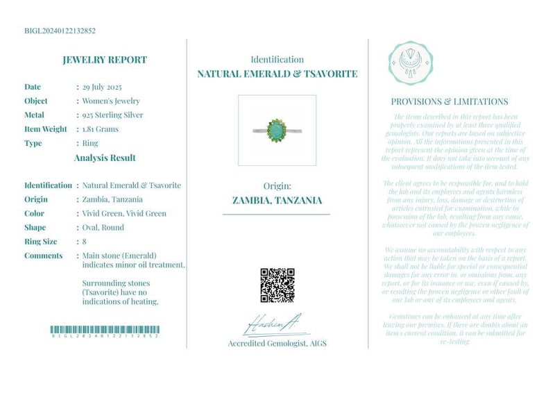 NATURAL EMERALD & TSAVORITE (UNTREATED) RING ON 925 SILVER - WITH DIGITAL CERTIFICATE ONLY Gemstone : Natural Emerald & Tsavorite (Untreated)Certificate (Digital): Bigl20240122132852Item Total Weight : 1.81 GramsMain Stone Color : Vivid Green, Vivid GreenSize : 8Comments : Main Stone (Emerald) Indicates Minor Oil Treatment.Surrounding Stones (Tsavorite) Have No Indications Of Heating.✻ Verify Report Online At Www.Bangkokinternationalgemlab.Co Condition: Good - Refer Images 01611138+26