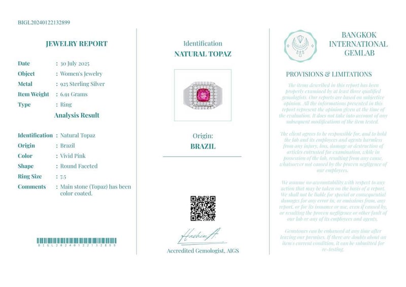 NATURAL TOPAZ RING ON 925 SILVER - WITH DIGITAL CERTIFICATE ONLY Gemstone : Natural TopazCertificate (Digital): Bigl20240122132899Item Total Weight : 6.91 GramsMain Stone Color : Vivid PinkSize : 7.5Comments : Main Stone (Topaz) Has Been Color Coated.✻ Verify Report Online At Www.Bangkokinternationalgemlab.Co Condition: Good - Refer Images 01611138+29