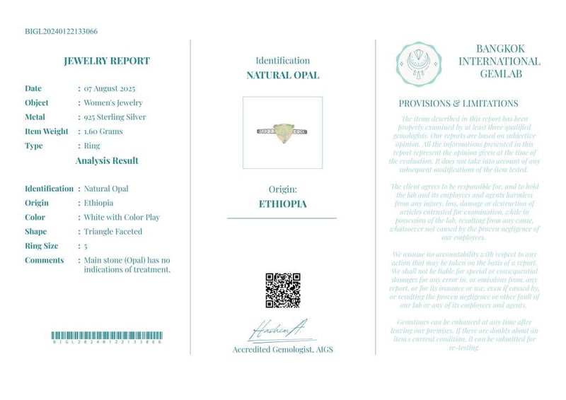 NATURAL OPAL RING ON 925 SILVER - WITH DIGITAL CERTIFICATE ONLY Gemstone : Natural OpalCertificate (Digital): Bigl20240122133066Item Total Weight : 1.6 GramsMain Stone Color : White With Color PlaySize : 5Comments : Main Stone (Opal) Has No Indications Of Treatment.✻ Verify Report Online At Www.Bangkokinternationalgemlab.Co Condition: Good - Refer Images 01611138+40