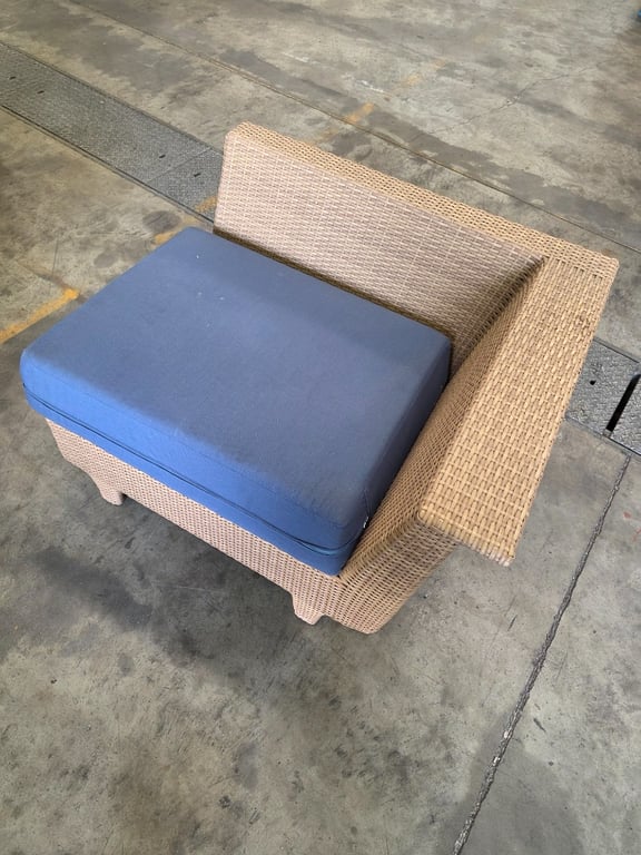 Modular part of outdoor wicker loveseat or sofa with cushions, The frame is made of synthetic rattan or wicker. Cushion is dark blueH: 65cm W: 85cm D: 200cmNote: Possible Signs of Wear and Tear
