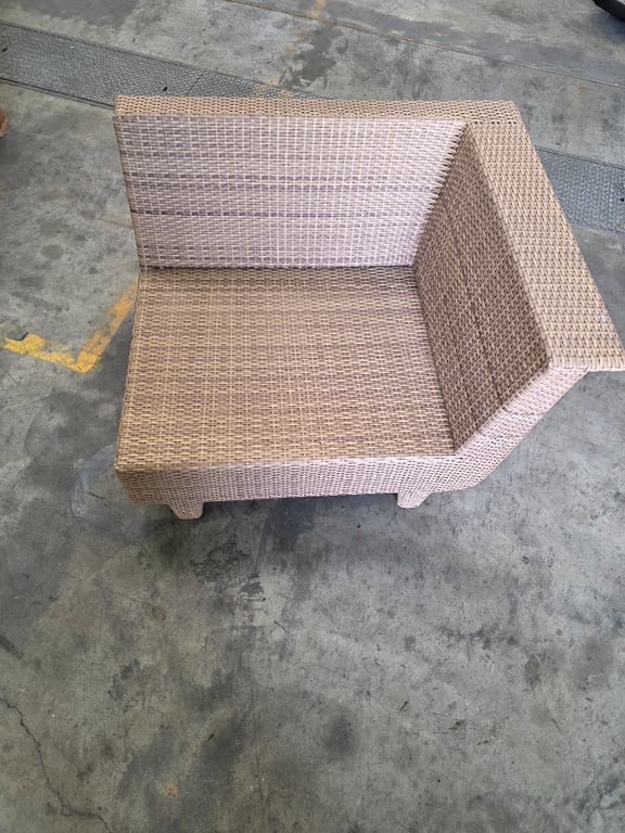 Modular part of outdoor wicker loveseat or sofa with cushions, The frame is made of synthetic rattan or wicker. H: 65cm W: 85cm D: 200cm Note: Possible Signs of Wear and Tear, Part only, no cushion