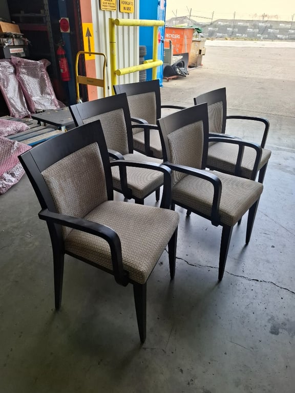 Dining chairs, Wooden frame, white & black upholstery x5 Dimensions: H 87.5cm x W 58.5cm x D 43cm Note: Signs of Wear and Tear Sold as lot