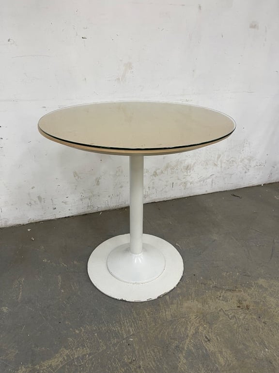 Cafe style/round pedestal table, timber finish surface protected by a glass cover, circular metal base. H: 76cm W: 76cm D: 76cm Note: Possible Signs of Wear and Tear