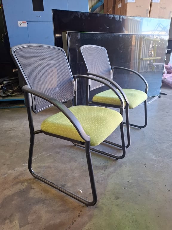 Dining chairs, aluminum frame, green upholstery x5 Dimensions: H 93cm x W 53.5cm x D 55cm Note: Signs of Wear and Tear Sold as lot