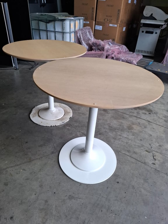 Circular outdoor table, timber top, tan finish x2 Dimensions: H 75.5m x W 75cm x D 75cm Note: Possible Signs of Wear and Tear SOLD AS LOT