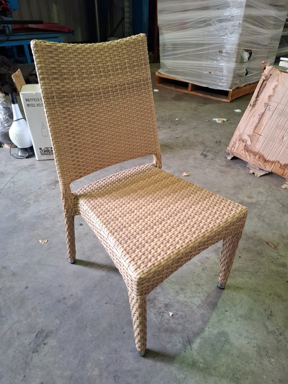 Woven wicker chairs Dark chairs Dimensions: 104cm (H) x 42cm (D) x 43cm (W) Light chair Dimensions: 88cm (H) x 49cm (D) x 47cm (W) NOTE: GENERAL WEAR AND TEAR SOLD AS LOT